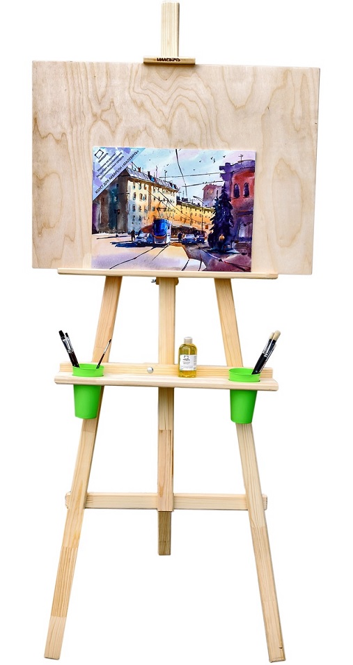 Бюджетный комплект для работы в студии, состоящий из соснового мольберта Лира с улучшенной функциональностью и большого планшета из шлифованной фанеры на подрамнике. Угол наклона опорной ноги мольберта можно изменять, высота полки и фиксатора холста также регулируется. Мольберт оснащен дополнительной широкой полкой для инструментов с отверстиями для стаканов с водой или кистей (стаканы входят в комплект). Вторая полка также позволяет работать с двумя холстами одновременно (например при создании копий).