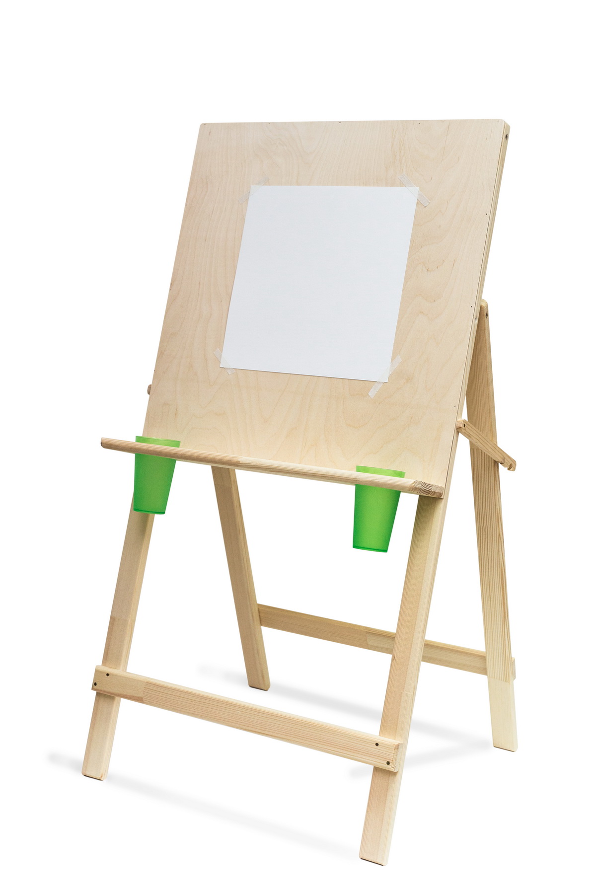 Деревянный мольберт "Хлопушка" с рабочим полем 60х60 см, высота 120 см, идеально подходит для детей, имеется полочка с отверстиями для двух стаканчиков (стаканчики в комплекте), ширина полки - 12 см. По обеим сторонам мольберта имеются фиксаторы задней опорной рамы, которые обеспечивают мольберту устойчивость. Углы на мольберте закруглены и отшлифованы. Бумага крепится к мольберту малярным скотчем или кнопками. Изготовлен из сосны.