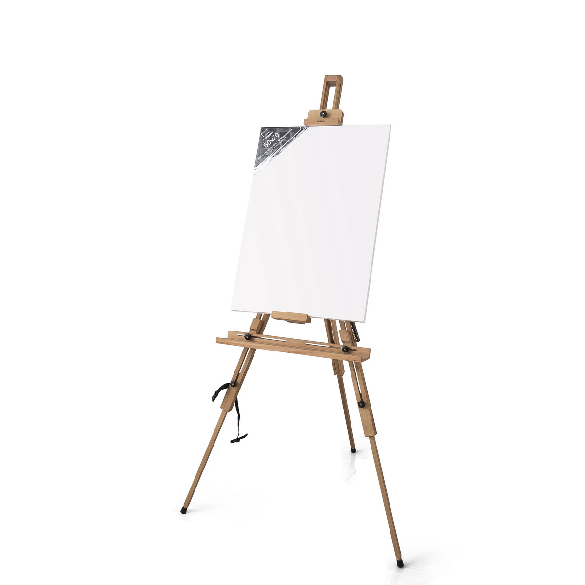 Складной мольберт-тренога. Может использоваться в помещении и на улице. Пригоден и для экспозиции. Позволяет задать любой угол наклона холста вплоть до горизонтального положения. Имеет дополнительную полку для кистей и красок. Компактен и прост в самостоятельной сборке. Выполнен из бука.