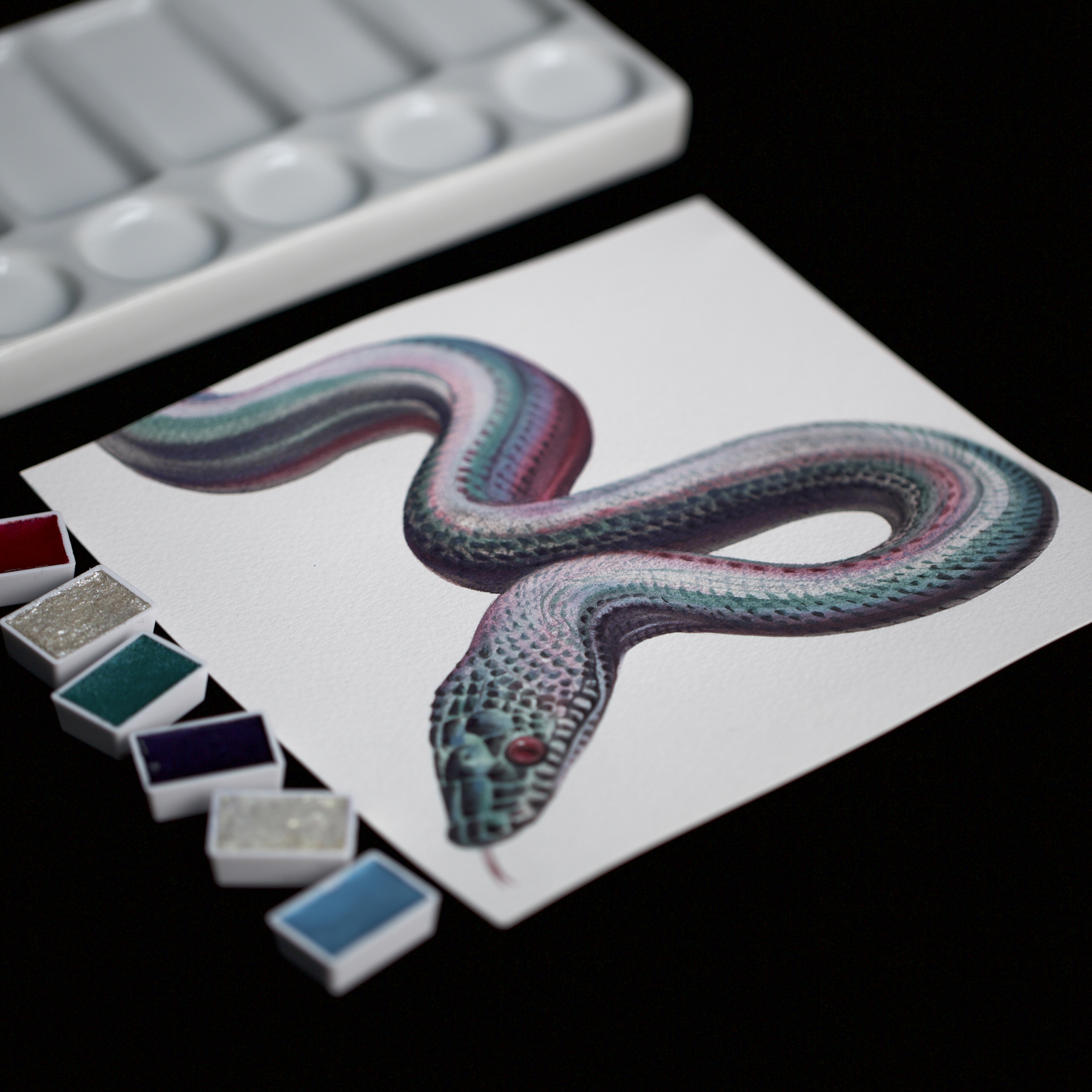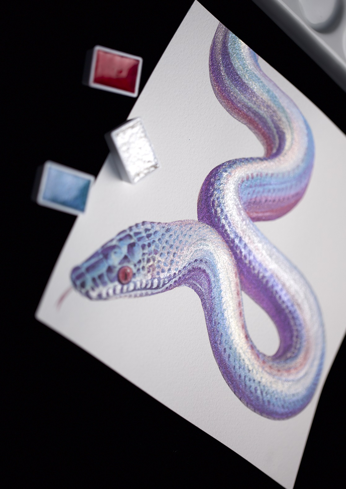 Мерцающая акварель прекрасно набирается из кюветы на кисть, позволяет работать пером в графической технике и технике каллиграфии.