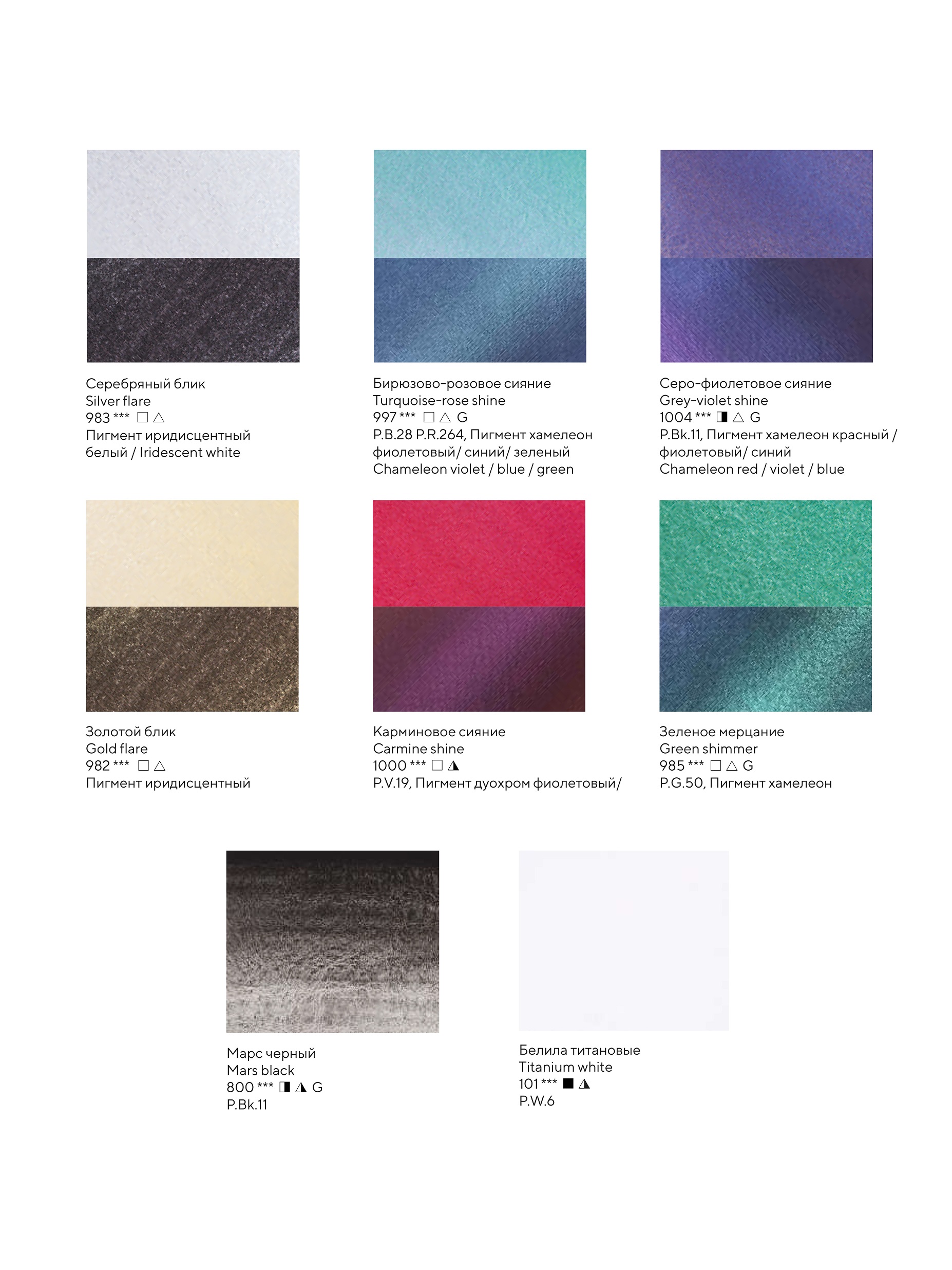 Состав набора: 983 Серебряный блик | 982 Золотой блик | 985 Зеленое мерцание | 997 Бирюзово-розовое сияние | 1004 Серо-фиолетовое сияние | 1000 Карминовое сияние | 101 Белила титановые | 800 Марс черный |