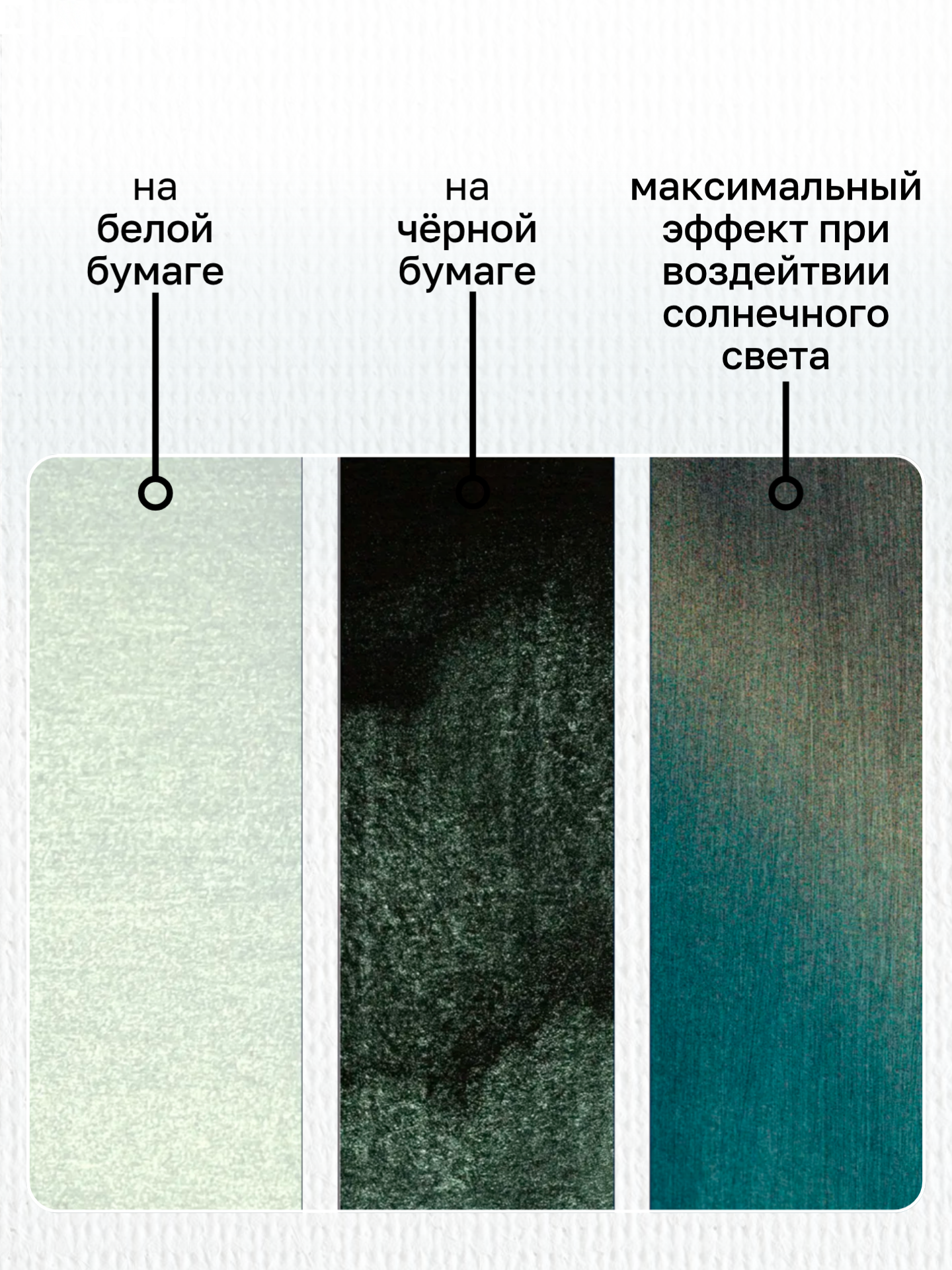 Оттенок акварели «Бирюзово-розовое сияние» - хамелеон в гранулирующей акварели, обладает богатым блеском и переливом цвета в работе на черной бумаге и гранулирующим основным тоном цвета с тонким зерном мерцания в работе на белых сортах бумаги.