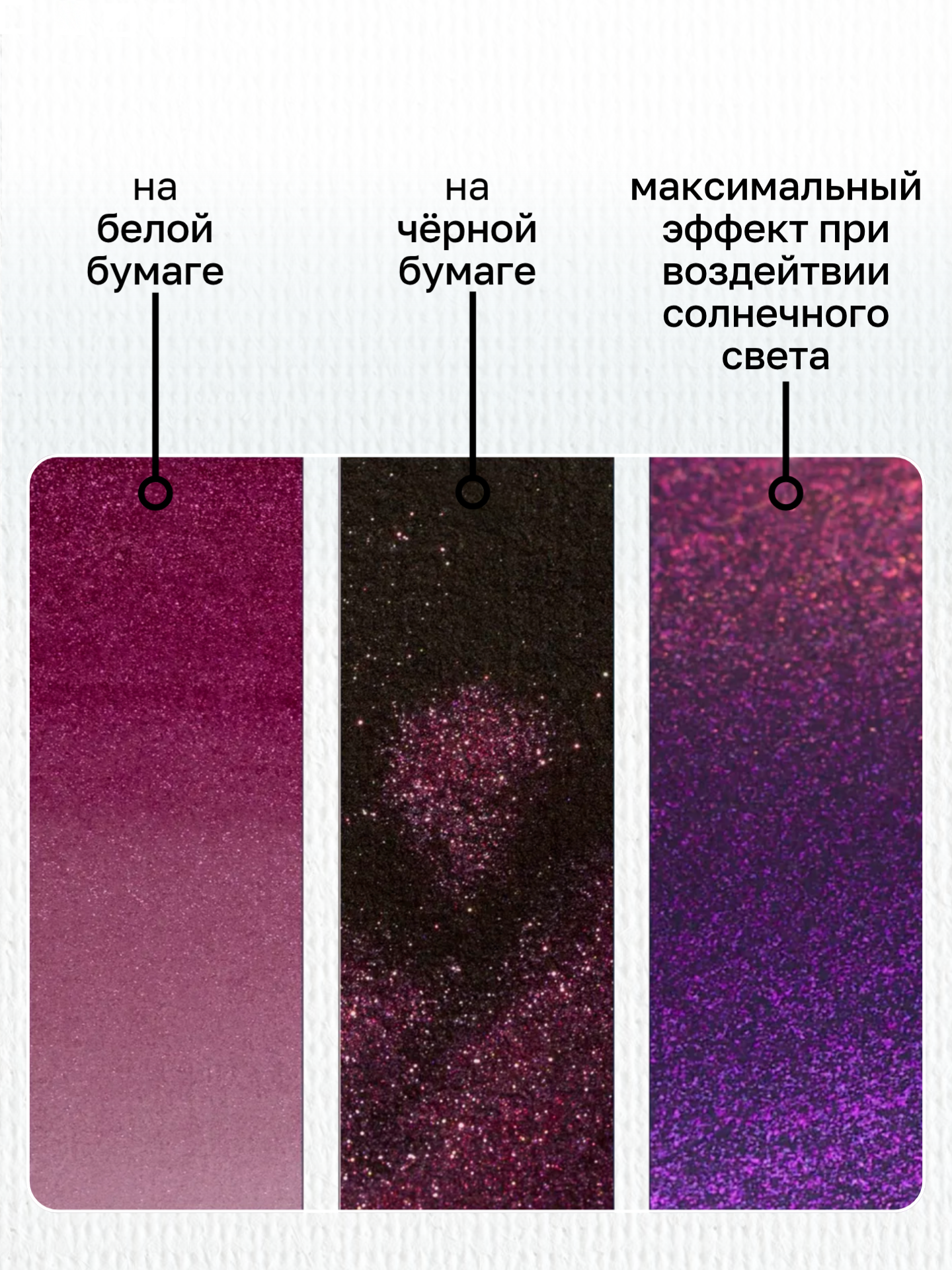 Оттенок акварели «Бирюзово-розовое сияние» - хамелеон в гранулирующей акварели, обладает богатым блеском и переливом цвета в работе на черной бумаге и гранулирующим основным тоном цвета с тонким зерном мерцания в работе на белых сортах бумаги.