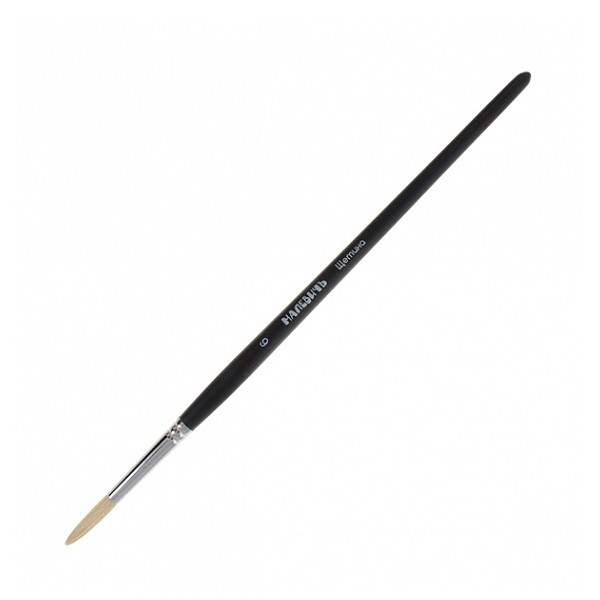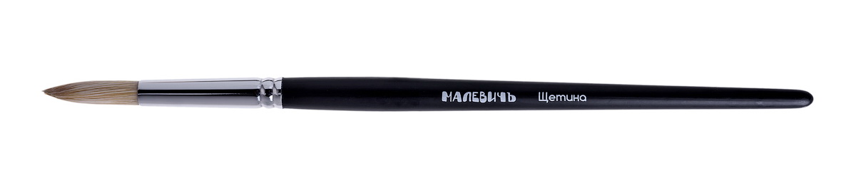 Круглая кисть Малевичъ из натуральной отбеленной свиной щетины высшего качества для работы гуашью, акрилом, маслом и темперой. Латунная обойма с антикоррозийным покрытием и двойным обжимом. Березовая ручка длиной 18 см покрыта черным матовым лаком.