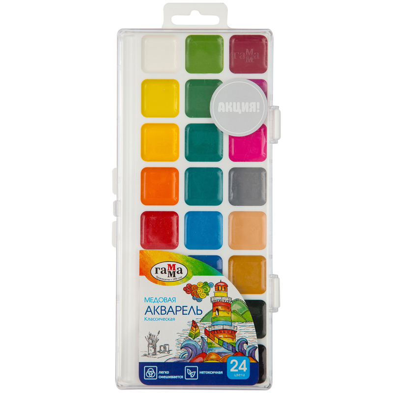 Набор акварели "Классическая", медовая, полусухая, 24 цвета, без кисти, пластик