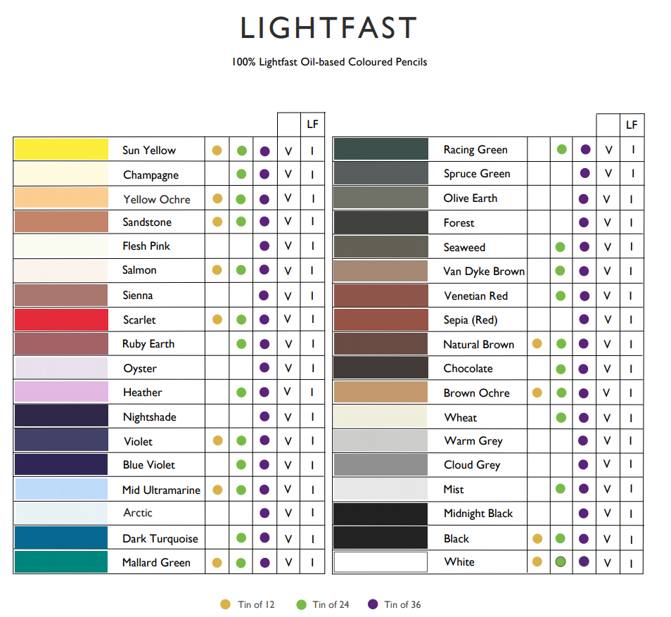 Серия Lightfast — это повышенный уровень содержания пигмента в каждом карандаше. Это первые карандаши в линейках Derwent, которые созданы на масляной основе. Из-за этого карандаши имеют кремовую текстуру, очень высокую светостойкость, в отличие от обычных карандашей, глубокую и насыщенную цветовую палитру. Все цвета серии имеют максимальный уровень светостойкости - гарантия сохранности и неизменности цвета более 100 лет (по стандартам Blue Wool Scale ISO 105 и ASTM D6901). Двойная проклейка карандаша по всей длине. Диаметр грифеля карандаша 4мм. Диаметр карандаша 8мм.