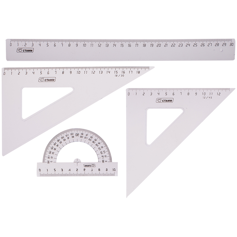 Набор чертежный большой из 4-х предметов. В набор входит: треугольник 2шт., линейка 30см, транспортир.