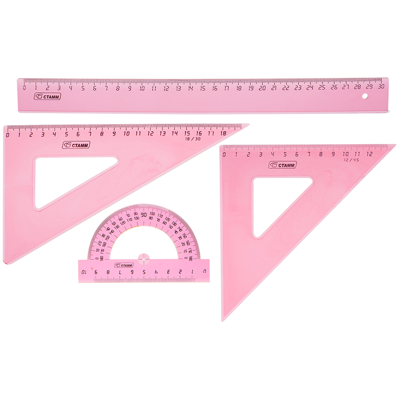 В набор входят: линейка 30 см, транспортир - 10/180, 2 треугольника - 12/45 и 18/30.