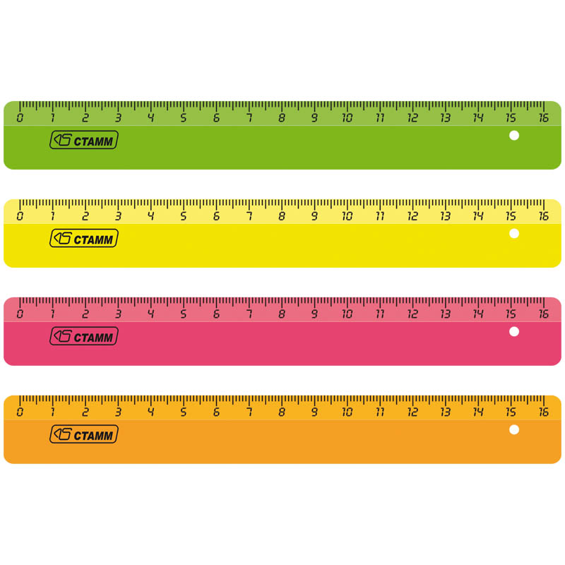 Яркие флуоресцентные цвета, безупречное качество пластика, безопасные закругленные углы, легкий корпус. Материал полистирол. Ровная четкая миллиметровая шкала. Отличается равномерным распределением красителя в корпусе.