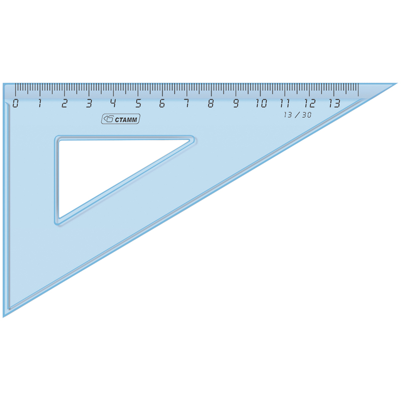 Треугольник 30°, 13см с четкой миллиметровой шкалой. Гладкая, глянцевая поверхность. Безопасные закругленные углы. Индивидуальный штрих-код на единице изделия. Цвет - тонированный голубой. Изготовлен из сертифицированного полистирола.