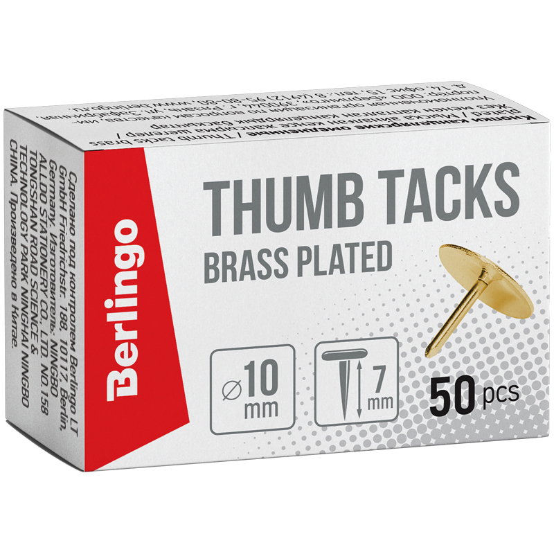 Кнопки-гвоздики омедненные для надежного крепления бумаги. Диаметр - 10 мм, длина острия - 7 мм. Упаковка в картонную коробочку - 50 шт.