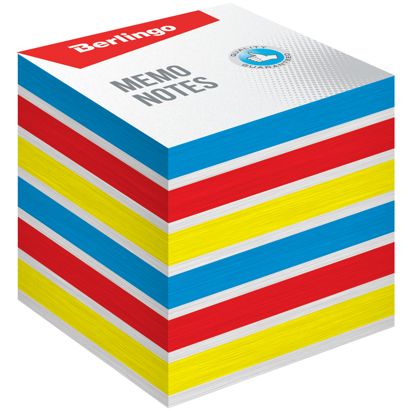 Блок для заметок на склейке из бумаги четырех пастельных цветов: розового, желтого, голубого и белого. Упакован в термоусадочную пленку