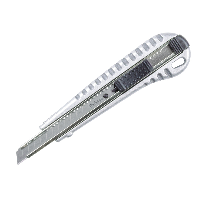 Серия Metallic . Алюминиевый корпус с противоскользящей резиновой накладкой на рукоятке. Стальное лезвие двигается по металлическим направляющим. Автоматическая фиксация лезвия AUTO-LOCK. На рукоятке съёмная деталь с прорезью для безопасного отламывания затупившейся части. Ширина лезвия - 9 мм. Индивидуальная упаковка - блистер с европодвесом.