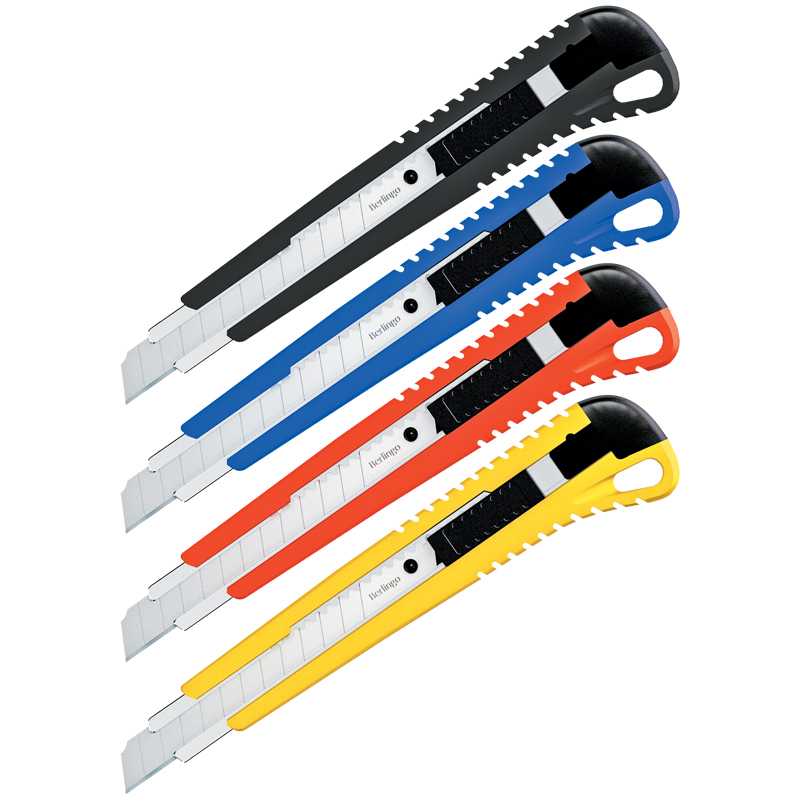 Серия «Universal». Эргономичная форма «под руку», стальное лезвие двигается по металлическим направляющим. Автоматическая фиксация лезвия AUTO-LOCK. На рукоятке съемная деталь с прорезью для безопасного отламывания затупившейся части лезвия. Ширина лезвия 9 мм. Цвета в ассортименте. Индивидуальная упаковка в блистер с европодвесом.