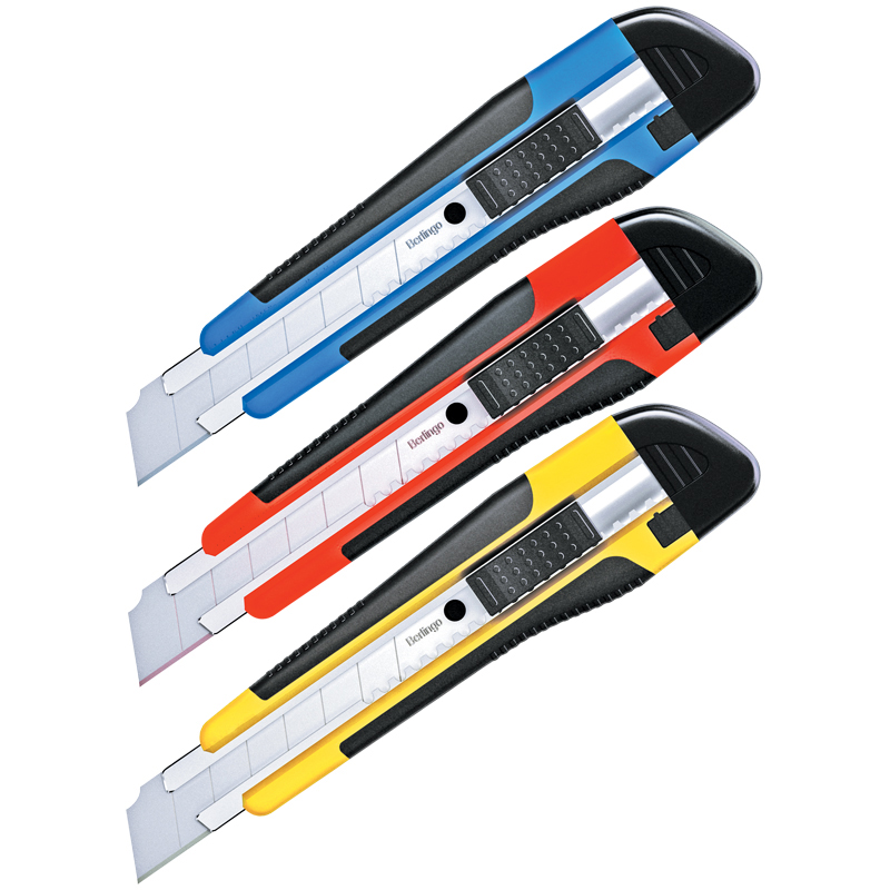 Серия Comfort. Эргономичная конструкция с противоскользящими резиновыми накладками на рукоятке. Стальное лезвие двигается по металлическим направляющим. Автоматическая фиксация лезвия AUTO-LOCK. На рукоятке съемная деталь с прорезью для безопасного отламывания затупившейся части лезвия. Ширина лезвия 18 мм. Снабжены дополнительным комплектом сменных лезвий (2 шт). Цвета в ассортименте. Индивидуальная упаковка в блистер с европодвесом.