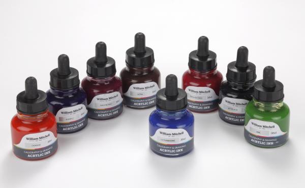 Акриловые чернила английской компании William Mitchell. Подходят для всех перьев William Mitchell и Joseph Gillott. В серии представлено 8 ярких цветов. Поставляются в бутылках по 30 мл с пипеткой для точного нанесения на перо.