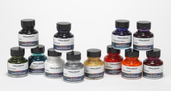 Жидкая гуашь английской компании William Mitchell. Проста в применении, обладает высокой укрывистостью и отличной светостойкостью. Изготавливается из тонко тертых пигментов. В серии представлено 12 насыщенных цветов по 30 мл. Все цвета отлично смешиваются друг с другом и растворяются в воде, что позволяет использовать жидкую гуашь с кисточками и перьевыми ручками. Не токсична. В наборе 4 цвета: темно-серый, оливково-зеленый, охра красная, фиолетовый.