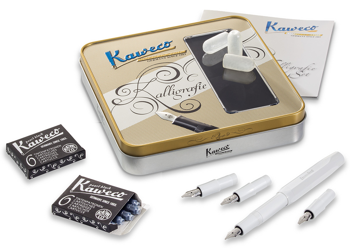 Большой набор для каллиграфии серии CALLIGRAPHY. Содержит ручку с пером 1,1 мм, а также три дополнительных пишущих узла (1,5, 1,9 и 2,3 мм). Кроме того, в наборе имеются 3 защитных колпачка и чернильный картридж. Цвет корпуса ручек: белый. Упаковка: жестяной футляр.