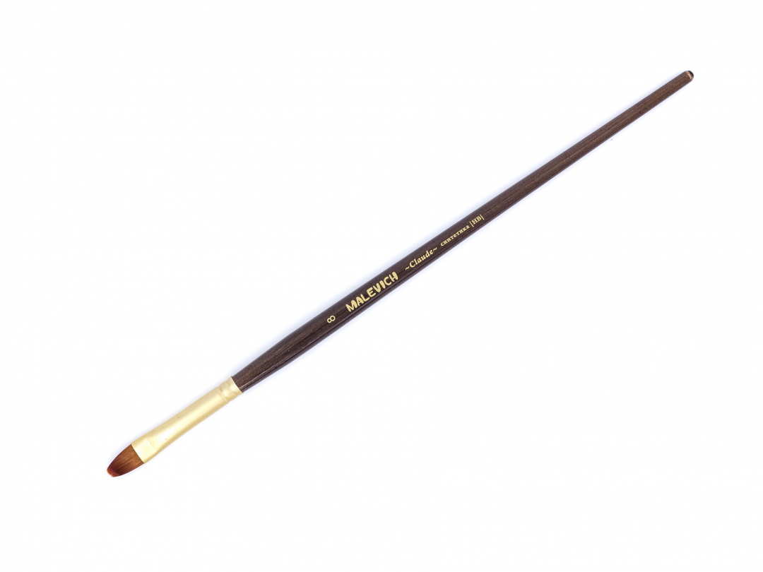 Кисти серии Claude изготовлены из синтетики золотистого цвета (Shining golden synthetic) иммитирующей ворс колонка. Это ворс средней жесткости, который отлично подходит для густых красок таких как масло, акрил, гуашь, темпера. Кисти выполнены в благородной цветовой гамме. Матовая золотая втулка, коричневый прозрачный лак и лаконичная маркировка делают эти кисти не только надежным художественным инструментом, но и красивым аксессуаром. Кисть держит свою форму даже при частом использовании, ворс прочно закреплен, а втулка не расшатывается со временем. Ручка кисти оптимальной средней длины - 18 см. Длина ворса (выставка) короткая. Номер кисти соответствует диаметру в мм. Серия имеет самое большое разнообразие размеров и форм среди ассортимента Малевичъ.